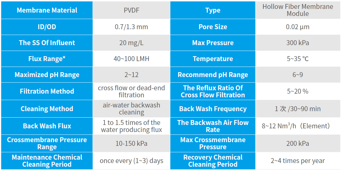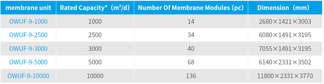 Notes: (1) *Treatment capacity with water temperature of 10℃ ;
