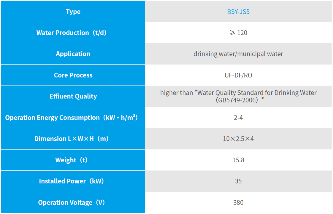 Product water includes ultrafiltration water produced, DF/RO water produced and DF/RO concentrated water. The packing machine can be adopted for soft bag packaging to meet different needs;
